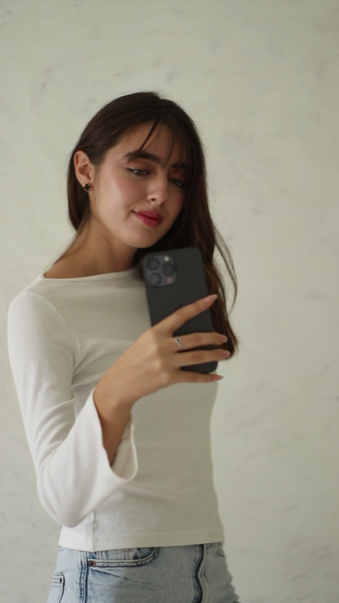 Polo manga larga hecho en 100% algodón acanalado doble, muy suave, delicado cuello recto que estiliza, mangas ligeramente acampanadas, perfecta para neutralizar cualquier outfit.